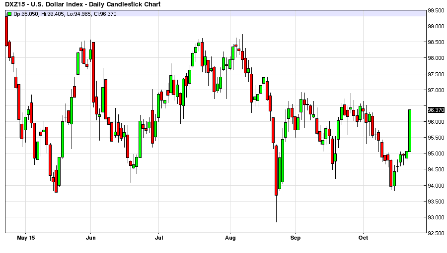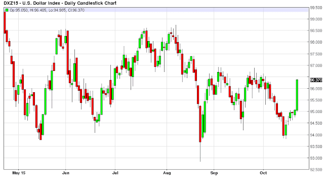 I was watching a little of the ECB policy press conference this morning and had a lot of thoughts which I may write about at a later date. However after the ultra-dovish ECB decision to signal to financial markets that they are going to add more stimulus in December with more bond buying in order to weaken the Euro currency, the US Dollar is back up to the 96.30 area on the DX, and financial markets haven`t really thought about the implications of this move by the US Dollar.