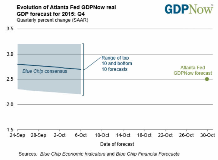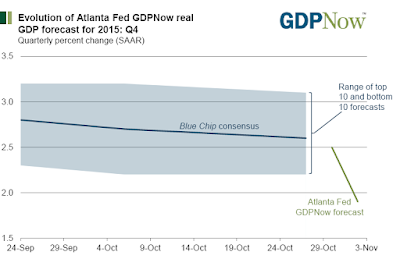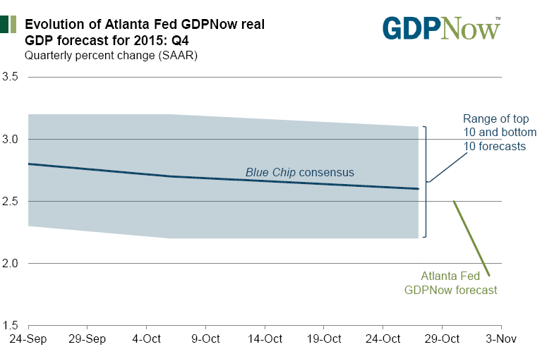 Inquiring minds may be interested in the initial Atlanta Fed GDPNow Estimate for 4th quarter 2015. Here is the chart.