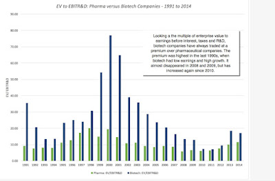 Bringing the changes in operating metrics and market value over time into one measure is difficult partly because biotechnology companies have lost money for the bulk of the last 25 years. The only multiple that can be computed for both groups is the ratio of enterprise value ( to earnings before interest, taxes and R&D (EBITR&D) and the graph below captures the shifts over time: