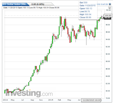 As noted by the last red candle, the US dollar index is now down for the week. The last time the dollar touched as high as it did today was in March of 2003.