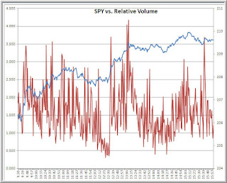 Here are two charts of Friday's trade in SPY (blue lines). The top chart tracks relative volume. That is the volume traded at each minute of the trading day as a function of the average volume typically traded during that minute. The proportion is expressed in standard deviation units, so that a zero reading means that average volume was traded; a 1.0 reading is one standard deviation above average; etc.