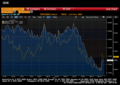 This remains one of my favorite Great Graphics that illustrate the divergence theme that I think is the main driver of the euro-dollar exchange rate. Composed on Bloomberg, it shows two time series. The first (white line) shows the German two-year yield minus the US two-year yield. It bottomed near -80 bp in mid-October and slid persistently through last Wednesday to hit reach almost -138 bp.