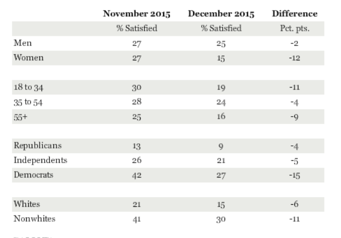 The recent high point in satisfaction is 32% in January and February of this year, the highest since the end of 2012. Satisfaction levels have been lower for the rest of this year. But despite month-to-month fluctuations, at least 25% of Americans have been satisfied each month until the December reading.