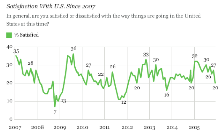 Although well above the 2008 low of 7%, Gallup reports After Terror Attacks, U.S. Satisfaction Falls to 13-Month Low of 20%.