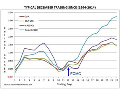 This Great Graphic shows how different measures of US equities perform in December by day for the past 20 years. I got it as a tweet from Urban Carmel, who got it from the Stock Almanac.