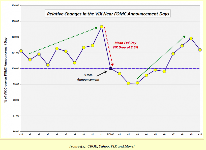 The second, of course, is that the Fed is expected to initiate raising rates this Wednesday. Further volatility before then might reduce the expected rise in rates. This event, given turbulence this week, has become a black box. Of note is that VIX typically rises ahead of the Fed and then falls after; if it does so again now, it will be a positive for equities after mid-week (data from Vix & More).