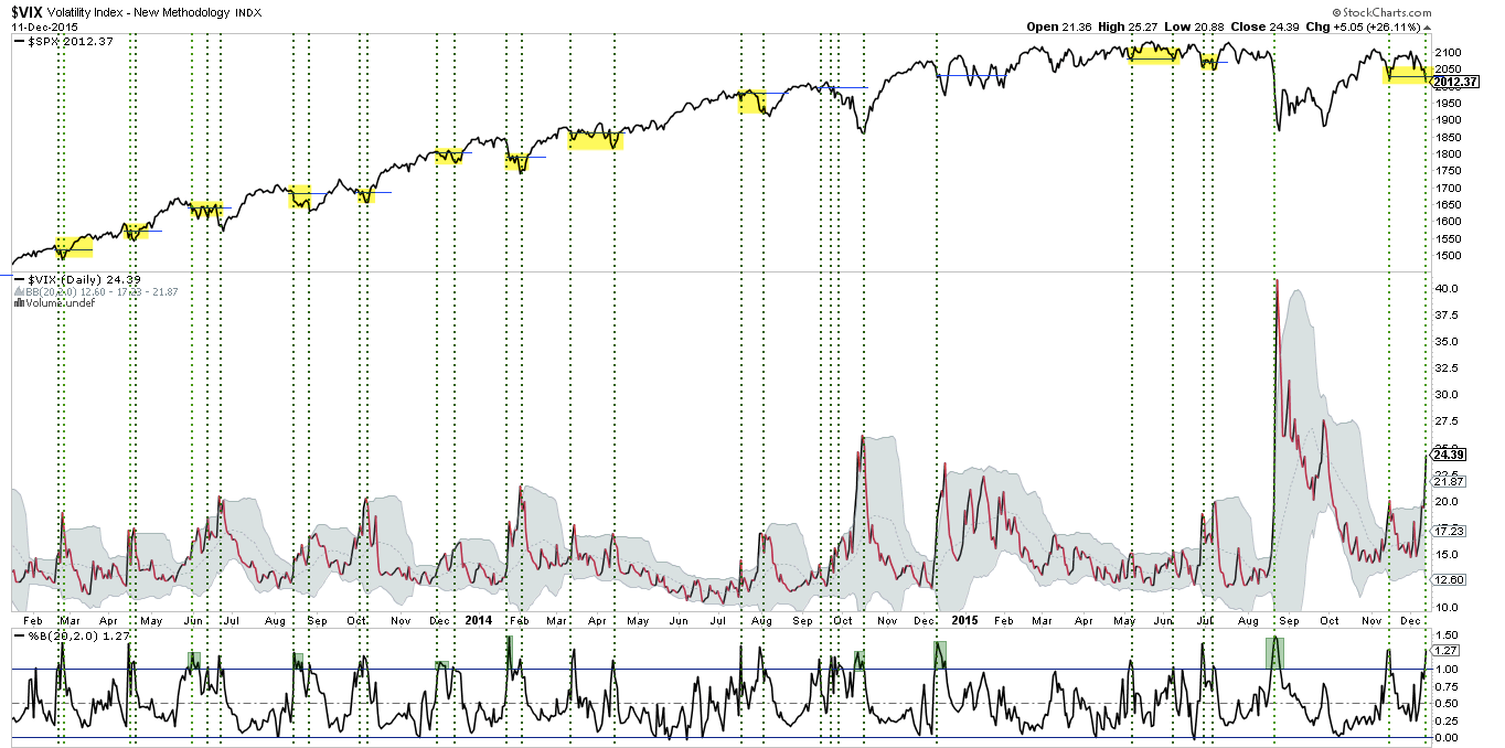 Friday also marked the second spike in VIX above its Bollinger Band (BB) in the past month. We've noted many times in the past that VIX spikes tend to come in pairs within a month, with SPY making a lower low with the second spike (as it did today). SPY then normally rises; the safe play is to wait for VIX to close back under its upper BB.