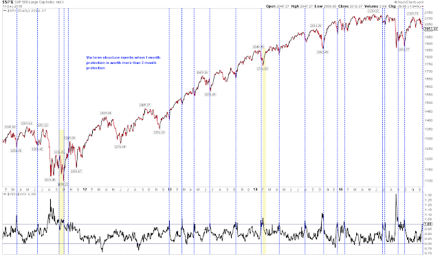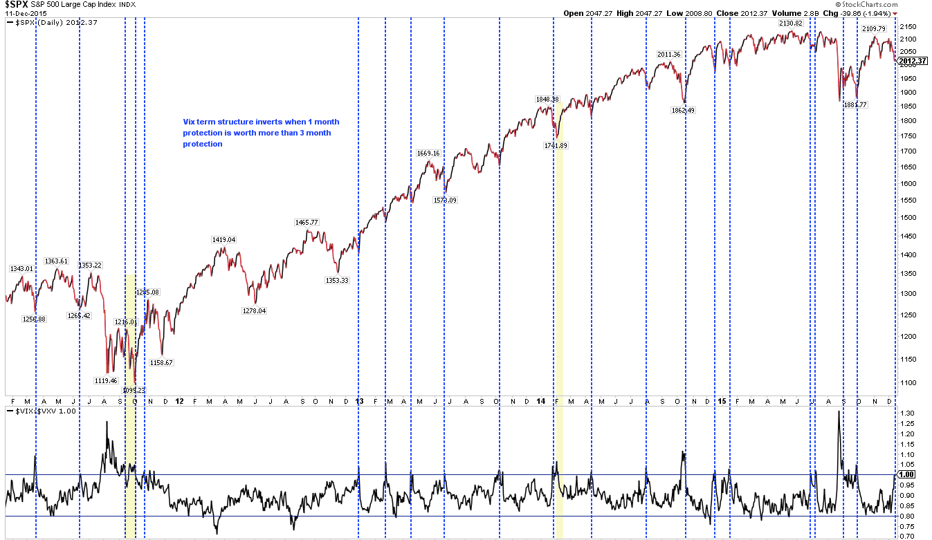 The VIX term structure also inverted on Friday. Again, this most often occurs very near a low in SPY (exceptions highlighted in yellow).