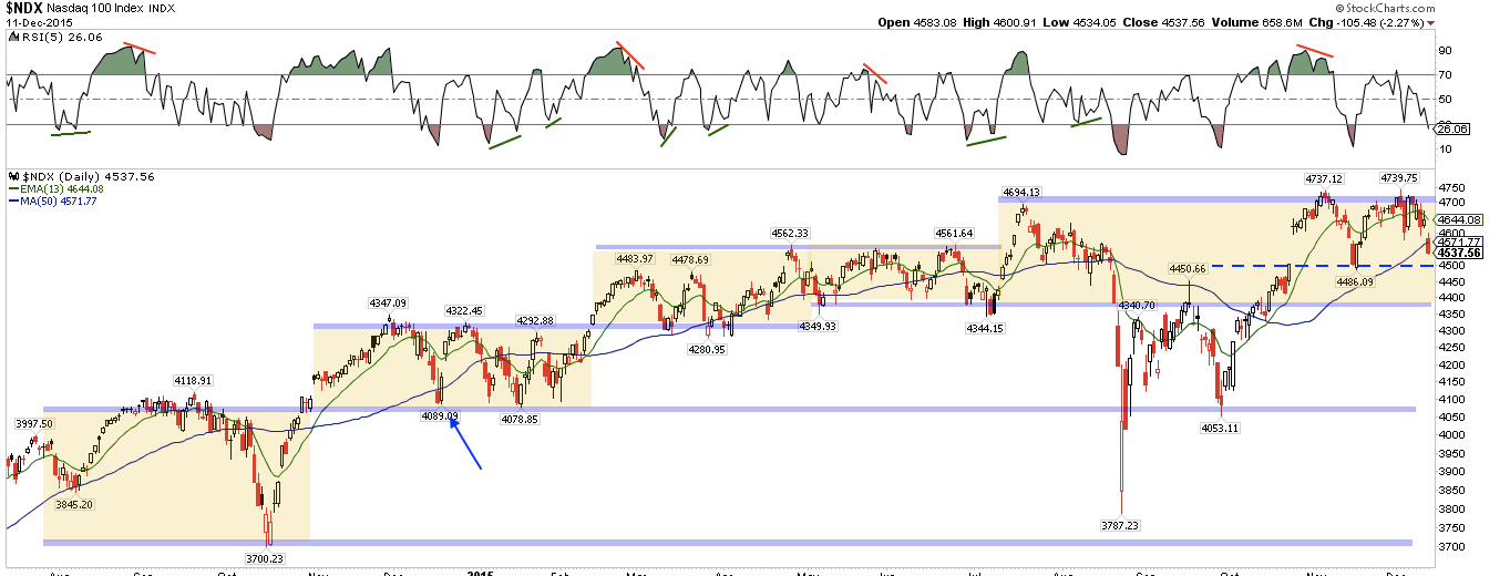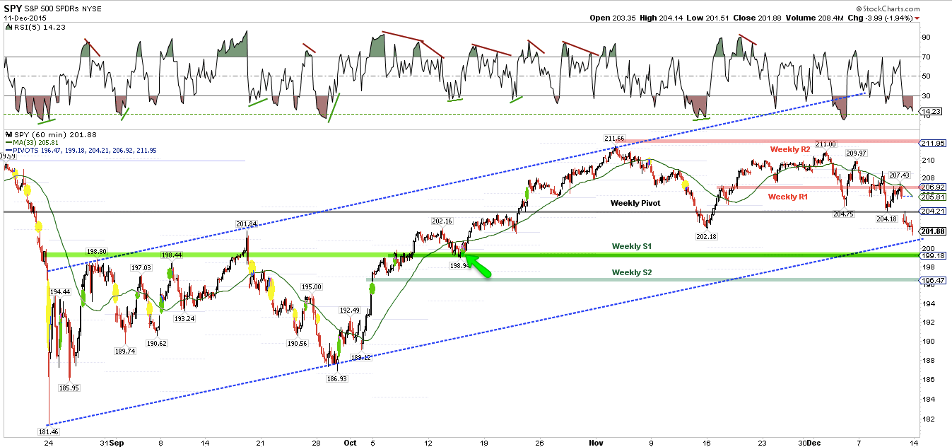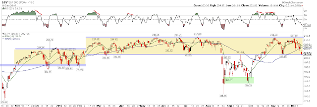 The drop this week put SPY near the bottom of its 2015 range. This comes just one week after closing about 1% from a new all-time high. While jarring, the index did the exact same move in the beginning of November. Aside from a month this summer, SPY has been trading between 202 and 212 since February.