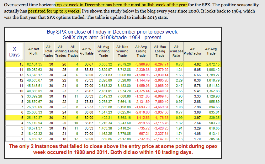 Next week is also December OpEx. This is one of the most bullish weeks of the year. SPY has closed higher from the prior week close within 10 days every time in the past 30 years (data from Rob Hanna).