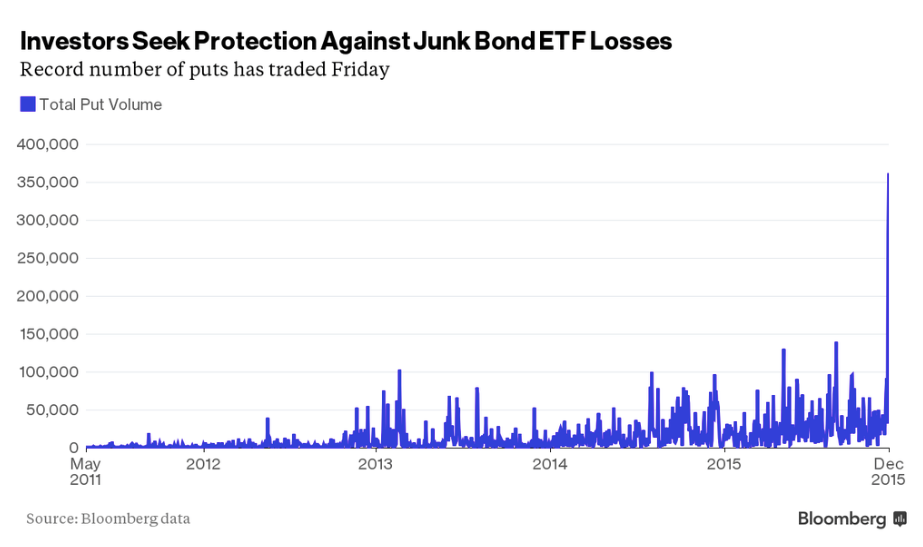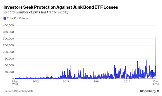 This vicious cycle has created an epic panic in the high-yield market. A record high number of puts traded on Friday. Put spikes in December 2014 and in August and September 2015 marked short-term reversal points in high-yield.