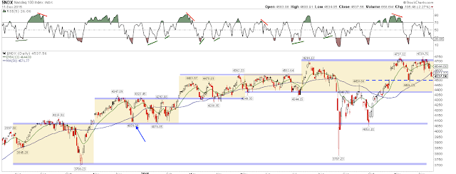 Recall that the leader, NDX, made a new ATH last week. It's in the middle of its range and about 1% above the mid-November pivot at 4500 (risk). This is the first backtest of the rising 50-dma in two months. Note that the market pierced this same moving average last December before a strong rally (arrow).