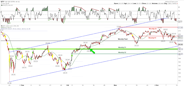 This area should be good initial support, as it has been in the past. If there is follow through weakness next week, the next level to watch is 199.3; this is WS1 (green line) and also an open gap from October 15 (arrow). That level represents risk of 1.5% from Friday's close.