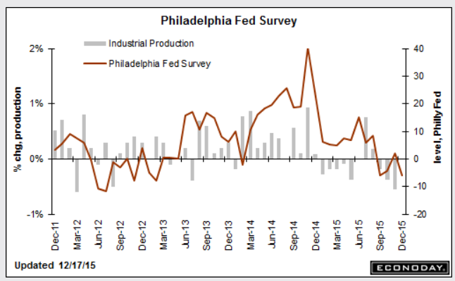 Another ominous detail in the report is a breakdown in the 6-month outlook, down more than 20 points to 23.0 which is low for this reading. Expectations for future orders are especially weak. Today's report falls in line with Tuesday's Empire State report and are both reminders that weak global demand, together with the breakdown in the energy and commodity sectors, are pulling down the nation's factory sector.