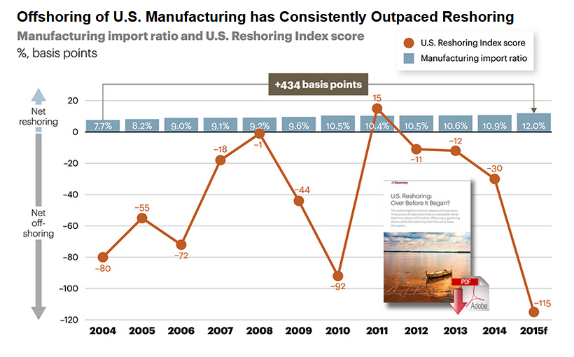 In 2015 the A.T. Kearney U.S. Reshoring Index dropped to -115, down from -30 in 2014, and represents the largest year-over-year decrease in the last 10 years.