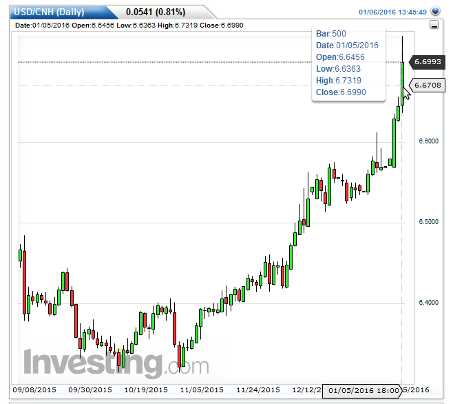 Currency trends suggest another yuan devaluation is coming up. Specifically, the gap between the mainland China yuan (renminbi) to the US dollar, vs. the offshore floating rate of the yuan to the US dollar is now at a record high.