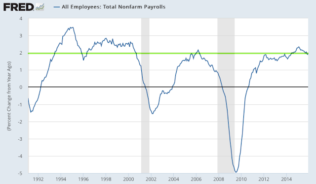 For this reason, it's better to look at the trend; in December, trend growth was 1.9% yoy. Annual growth continues to be close to the highest since the 1990s. Employment growth in 2014-2015 has been better than at any time during the 2003-07 bull market.