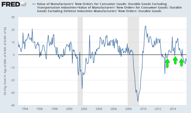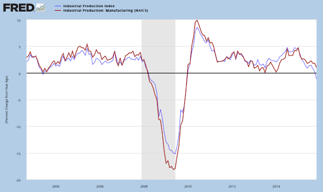 Industrial production growth was -1.2% in November. The more important manufacturing component (excluding mining and oil/gas extraction; red line) grew 1.0%. It's a volatile series: manufacturing growth was lower at points in both 2013 and 2014 before rebounding strongly.
