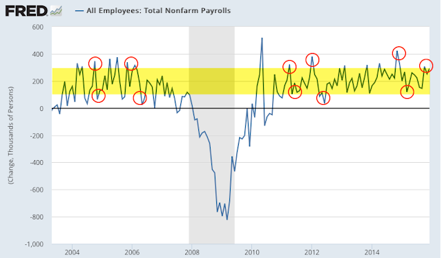 Monthly NFP prints are normally volatile. Since 2004, NFP prints near 300,000 have been followed by ones near or under 100,000. That has been a pattern during every bull market; NFP was negative in 1993, 1995, 1996 and 1997. The low print of 119,000 in March, as well as the 'disappointingly weak' print in September, fit the historical pattern. This is normal, not unusual or unexpected.