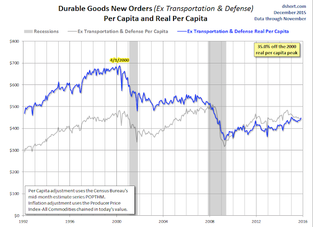 Core durable goods orders (excluding military, so that it measures consumption, and transportation, which is highly volatile) fell 5% yoy (nominal) in November. It grew 4% a year ago, so the yoy comparable is unfavorable. During the heart of the prior bull market, growth was typically 7-13%. Weak growth in winter has been a pattern the past three years (arrows), but it has not bounced back this year.