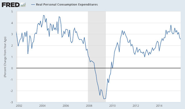 Similarly, the "real personal consumption expenditures" component of GDP (defined), the component which accounts for about 70% of GDP, grew at 3.1% yoy in 3Q15. The last four quarters have seen the highest growth rate in 8 years. This is approaching the 3-5% that was common in prior expansionary periods after 1980.