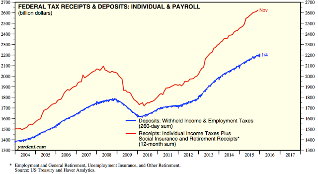 For those who doubt the accuracy of the BLS employment data, federal tax receipts are also accelerating (red line), a sign of better employment and wages (data from Yardeni).
