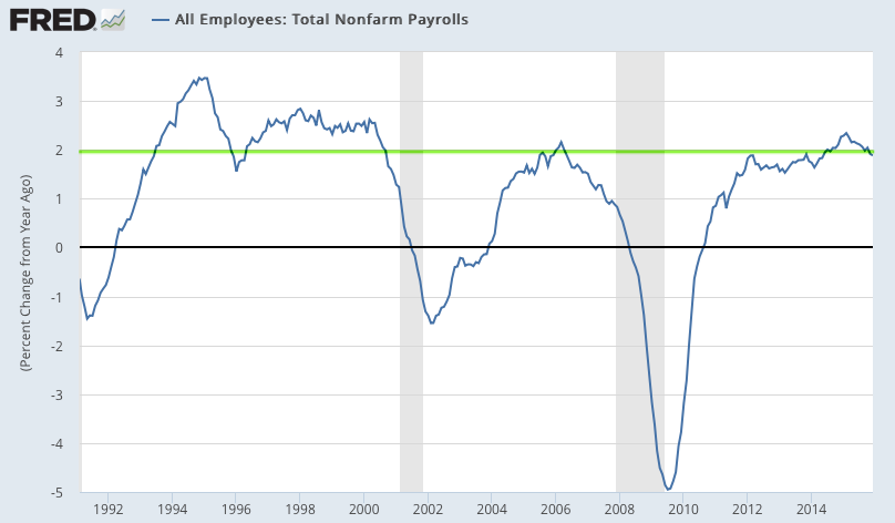 For this reason, it's better to look at the trend; in December, trend growth was 1.9% yoy. Annual growth continues to be close to the highest since the 1990s. Employment growth in 2014-2015 has been better than at any time during the 2003-07 bull market.