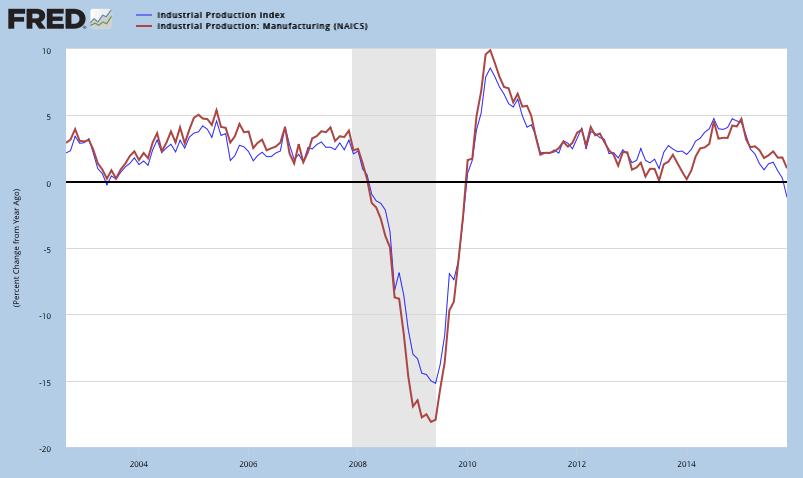 Industrial production growth was -1.2% in November. The more important manufacturing component (excluding mining and oil/gas extraction; red line) grew 1.0%. It's a volatile series: manufacturing growth was lower at points in both 2013 and 2014 before rebounding strongly.