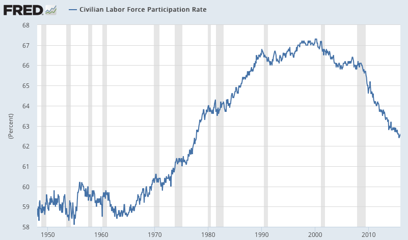 The labor force participation rate (the percentage of the population over 16 that is either working or looking for work) continues to fall. This has little to do with the current recovery; the participation rate has been falling for 15 years. Participation is falling as baby boomers retire, exactly as participation started to rise in the mid-1960s as this group entered the workforce. Another driver is women, whose participation rate increased from about 30% in the 1950s to a peak of 60% in 1999.