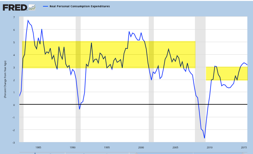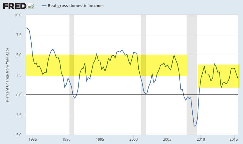 Real GDI growth through 3Q15 was 2.1% yoy. This is near the low end of the range of prior expansionary periods since 1980 (2.5-5% yoy).