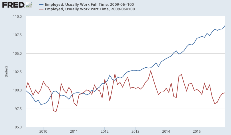 Employment is being driven by full-time jobs (blue line), not part-time jobs (red line).