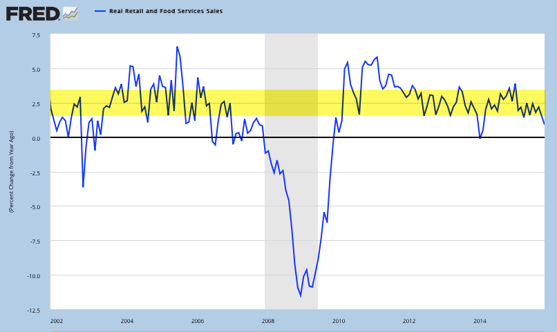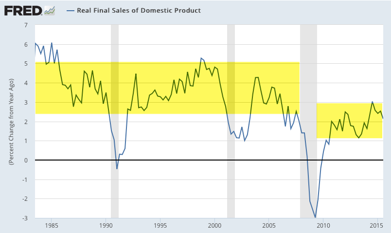 Stripping out the changes in GDP due to inventory produces "real final sales". This is a better measure of consumption growth than total GDP. In 3Q15, this grew 2.1% yoy (it was 3.0% in 3Q14, so here too the yoy comparable is unfavorable). A sustained break above 2.5% would be noteworthy.