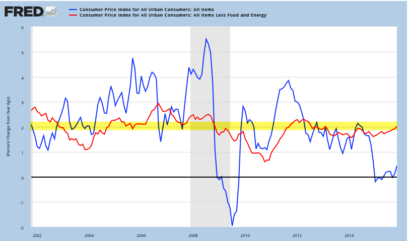 CPI (blue line) was 0.4% last month. The more important core CPI (excluding more volatile food and energy; red line) grew 2.0%, the highest level since October 2012.