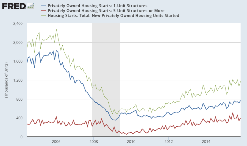 Single family housing starts (blue line) were the highest since the recession. Multi-unit housing starts (red line) is flat over the past year.