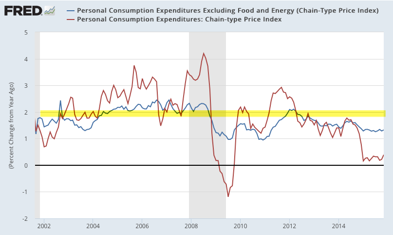 The Fed prefers to use personal consumption expenditures (PCE) to measure inflation; total and core PCE were 0.4% and 1.3% yoy, respectively, in November. Neither has been above 2% since 2Q 2012.