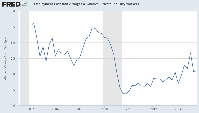 3Q15 employment cost index shows compensation growth was 2.1% yoy. This is down from 2.7% in 1Q15, which was the highest growth since the recession.