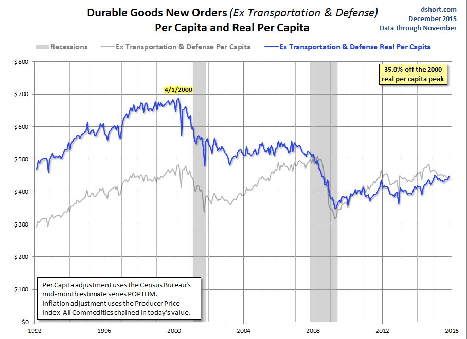 Core durable goods orders (excluding military, so that it measures consumption, and transportation, which is highly volatile) fell 5% yoy (nominal) in November. It grew 4% a year ago, so the yoy comparable is unfavorable. During the heart of the prior bull market, growth was typically 7-13%. Weak growth in winter has been a pattern the past three years (arrows), but it has not bounced back this year.