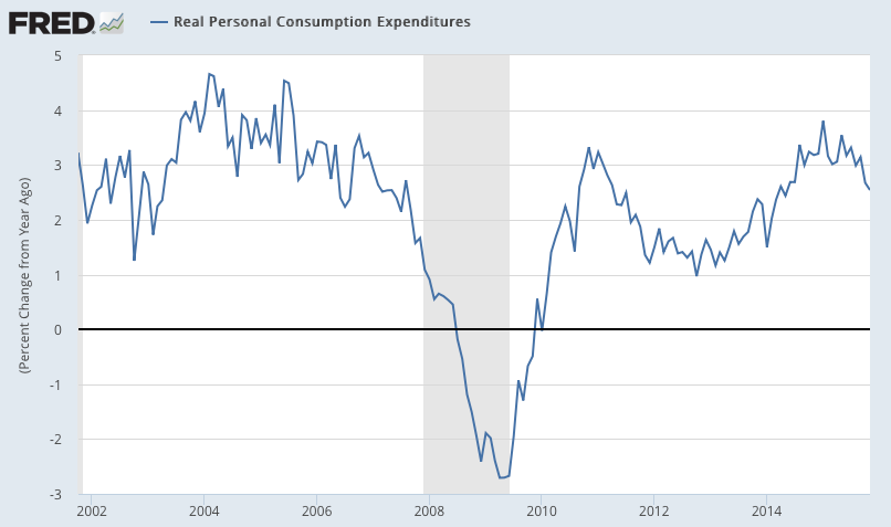 Similarly, the "real personal consumption expenditures" component of GDP (defined), the component which accounts for about 70% of GDP, grew at 3.1% yoy in 3Q15. The last four quarters have seen the highest growth rate in 8 years. This is approaching the 3-5% that was common in prior expansionary periods after 1980.
