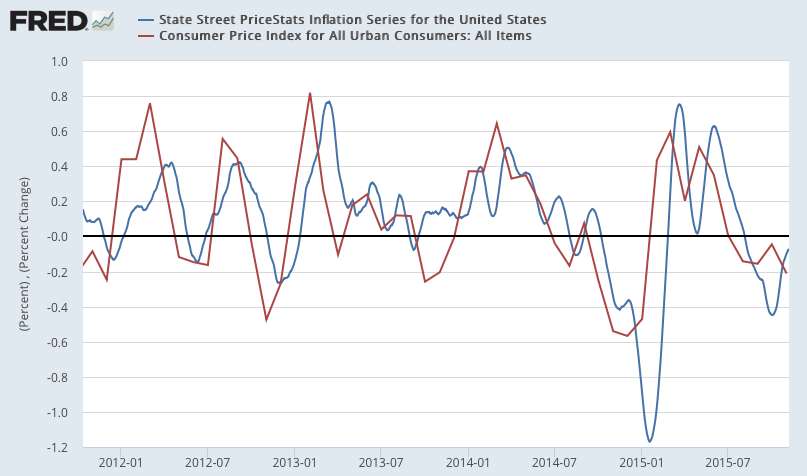 For some reason, many mistrust CPI and PCE. MIT publishes an independent price index (called the billion prices index). It tracks both CPI and PCE closely.