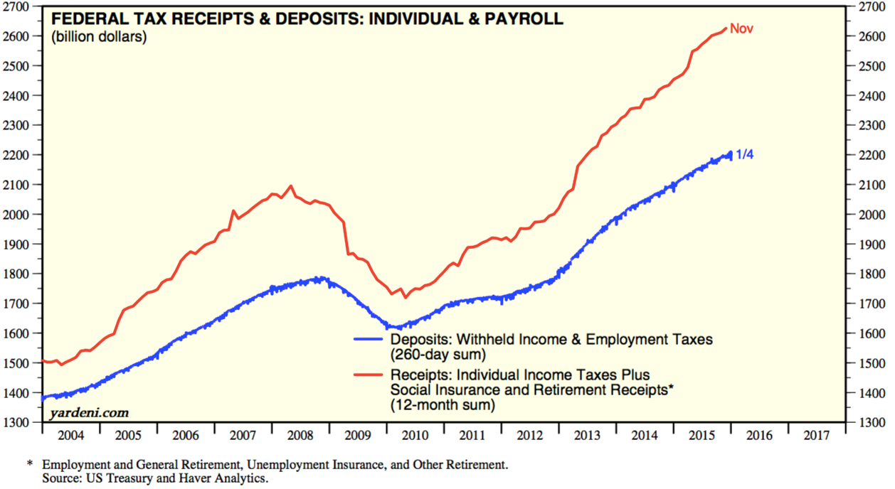 For those who doubt the accuracy of the BLS employment data, federal tax receipts are also accelerating (red line), a sign of better employment and wages (data from Yardeni).