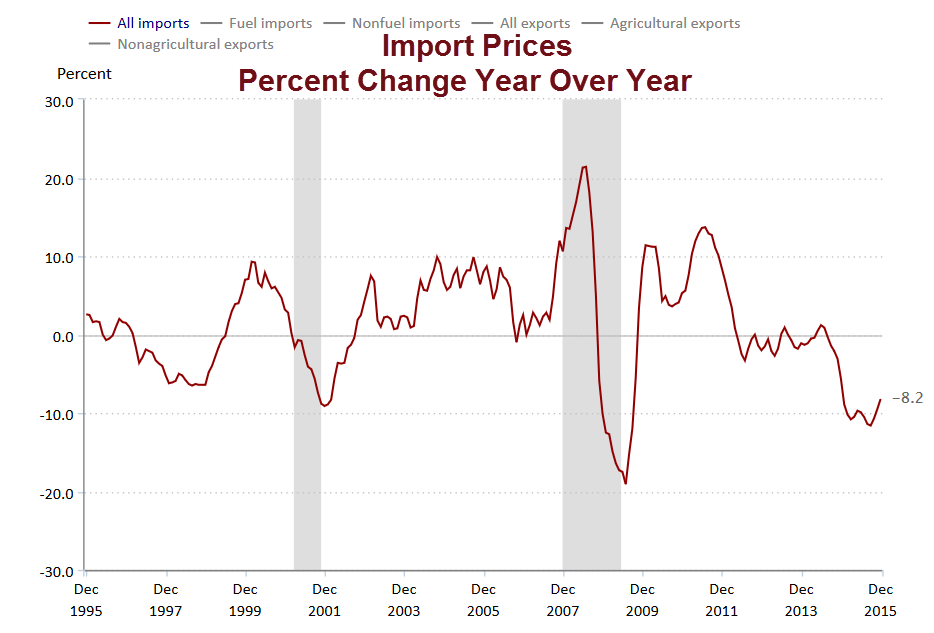Export and import prices continued the collapse today according to the latest BLS Data. Export prices fell 1.1%, over double the Econoday consensus estimate of -0.5% and also lower then the lowest economist’s forecast of -0.8%. Import prices sank 1.2% less than the consensus estimate of -1.4%.