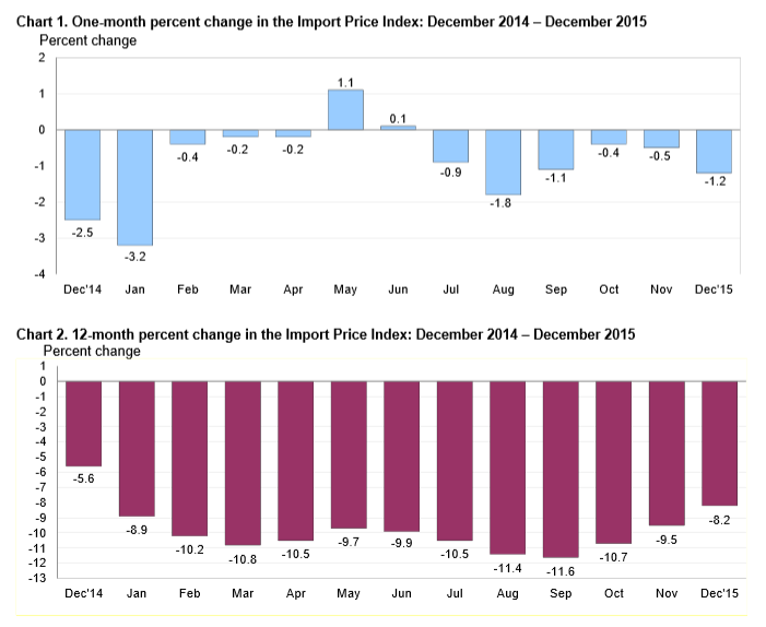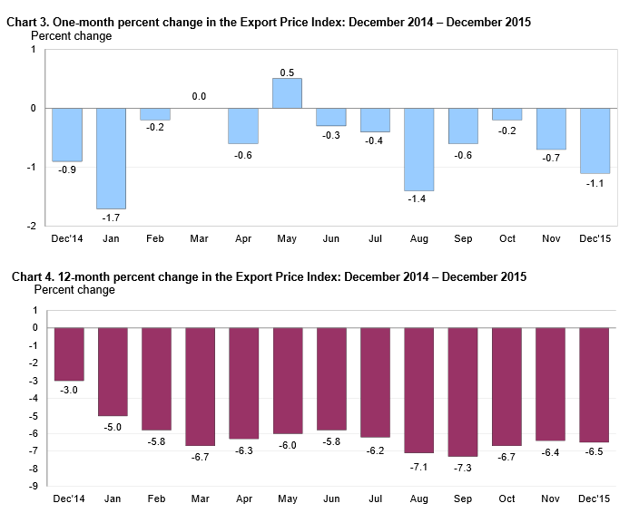 Year-on-year, total import prices for 2015 fell 8.2 percent which is the largest drop since 2008. Export prices, down 6.5 percent in 2015, are at a record low for the entire series which goes back to 1989. Export prices excluding agriculture, down 5.9 percent, is also a record low.