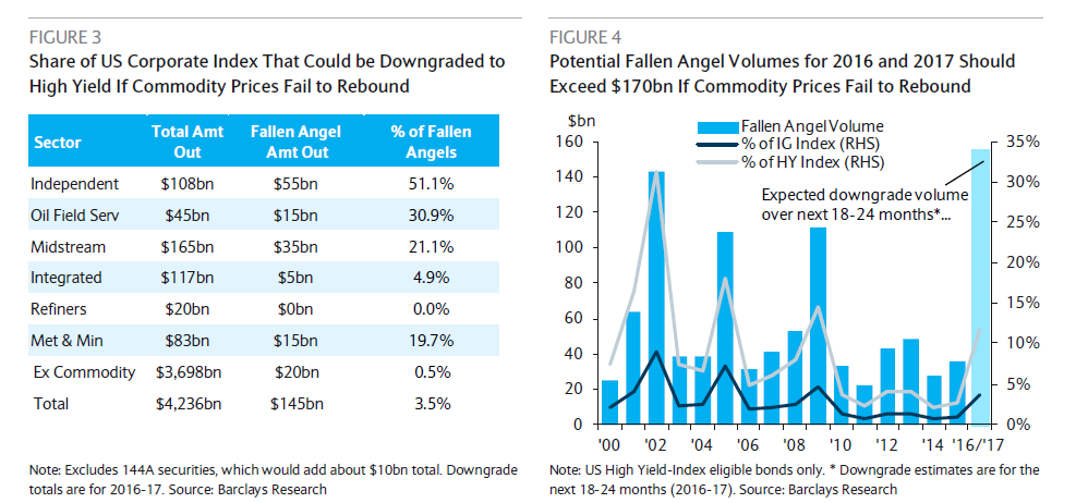 Many highly leveraged and poorly managed drillers have been able to hide under the cloak of high oil prices (and Wall Street) in the past few years. Now Barclays estimates that without a rebound in commodity prices, the potential oil bonds downgrade volume for 2016 and 2017 could exceed $170 Bn while another $155 billion worth of high-yield debt supply will enter the market.