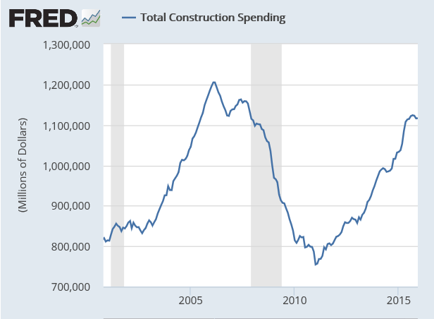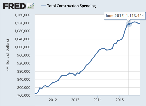 Total construction spending has stalled since June 2015.