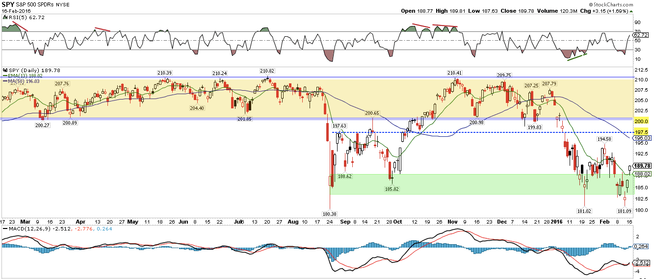 A small, 8% bear market rally that started from Thursday's close of $183 on SPY would make it to $197.5. A rally to the 50-dma would take SPY to about $195-196, assuming it lasted only a week or so. $196.5 is also equivalent to a 50% retrace from the November high.