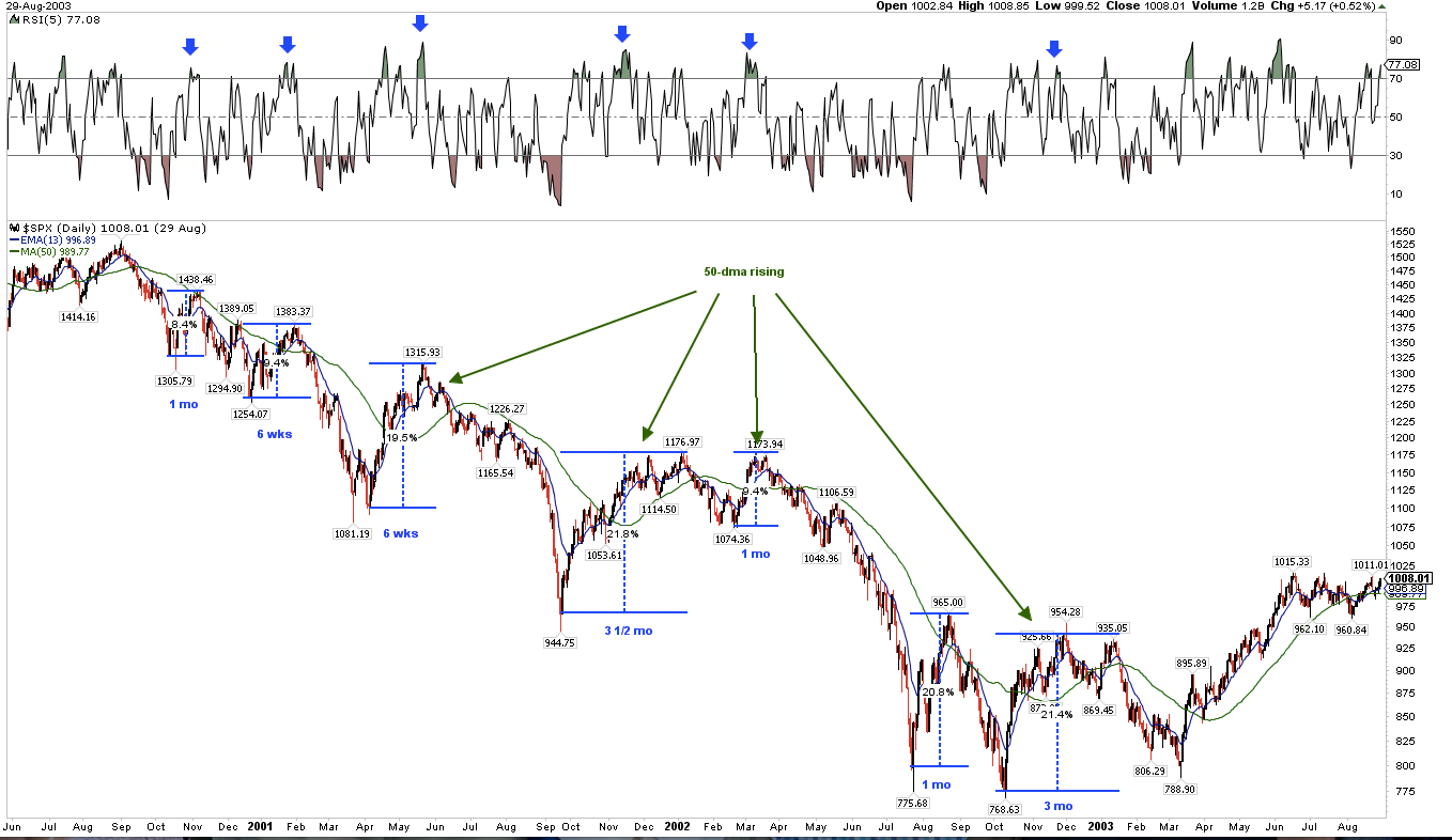 Each of these rallies had a hard time staying overbought. These rallies generally started to fail as soon as RSI(5) exceeded 70% (top panel). The one exception was the March-May 2008 rally, which was strong enough to turn the 50-dma upwards. That gain was 12%.