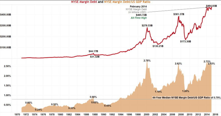 Irresponsible central banker policies are forcing consumers to overspend. Auto loans today are like home loans in 2006. Perhaps nowhere are low rates more visible than in the stock market, where investors have been "forced to buy risk assets". Margin debt today is as high as at the stock market bubble peaks in 2000 and 2007; the S&P fell 50% within two years both times.