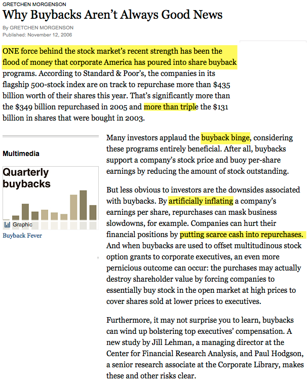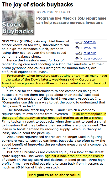As the article states: "the end goal is to raise share value." This was nearly 20 years ago (link). And share buyback popularity (and criticism) was just as common 10 years ago, too (link).