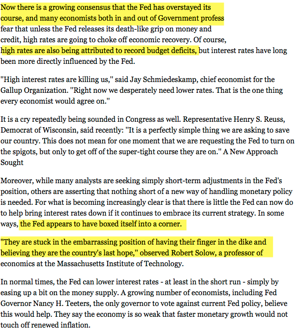 The year these words were written is 1982, when America was on the threshold of an 18 year bull market. But central bankers and their policies were as hated then as they are today (from the NYT).