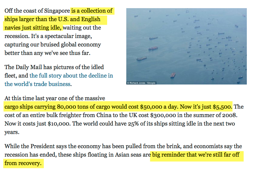 Weakness in China and the rest of the world is reflected in shipping rates, also known as the Baltic Dry Index. The cost of shipping has fallen 90%. A fleet of ships larger than the US navy lay idle. It's a big reminder that the economic recovery is still far off.